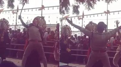मैहर में ड्यूटी पर पुलिस जवान का अनोखा अंदाज, माता भक्ति में झूमे