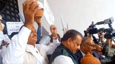 बजट से पहले विपक्ष का हंगामा, खाली गुल्लक लेकर किया प्रदर्शन