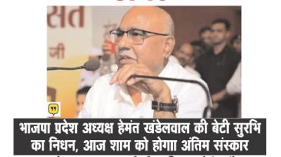 भाजपा प्रदेश अध्यक्ष हेमंत खंडेलवाल के परिवार में दुखद घटना, बेटी सुरभि खंडेलवाल नहीं रहीं