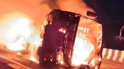 मैहर NH-30 पर बड़ा हादसा टला, चिंगारी से धधकी बस मिनटों में जलकर खाक
