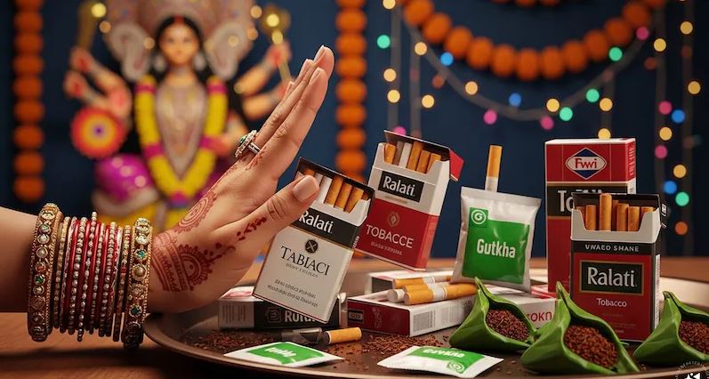तंबाकू : नवरात्रि के दौरान, तंबाकू उत्पादों जैसे सिगरेट, गुटखा या तंबाकू युक्त पान से आम तौर पर परहेज़ किया जाता है. यह त्योहार आत्म-अनुशासन और शरीर तथा मन दोनों की शुद्धि को प्रोत्साहित करता है; परिणामस्वरूप, ऐसी चीज़ों की खरीदारी को भक्ति की भावना के विपरीत माना जाता है. (सभी चित्र AI द्वारा निर्मित हैं)