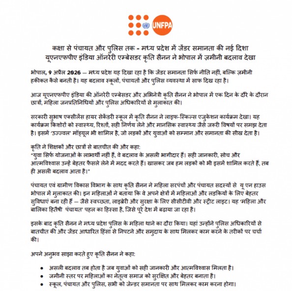 मध्य प्रदेश यह दिखा रहा है कि जेंडर समानता सिर्फ नीति नहीं, बल्कि जमीनी हकीकल कैसे बनती है. यह बदलाव स्कूलों, पंचायतों और पुलिस व्यवस्था में साफ दिख रहा है. आज यूएनएफपीए इंडिया की ऑनरेरी एम्बेसडर और अभिनेत्री कृति सैनन ने भोपाल में एक दिन के दौरे के दौरान छात्राओं, महिलाओं, जनप्रतिनिधियों और पुलिस अधिकारियों से मुलाकात की.