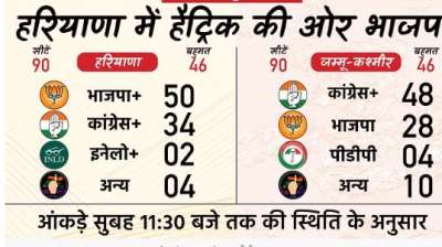 नई दिल्ली । हरियाणा और जम्मू-कश्मीर विधानसभा चुनाव के लिए वोटों की गिनती जारी है। शुरुआती रुझानों में हरियाणा में भाजपा ने बहुमत का आंकड़ा पार कर लिया है। इस...