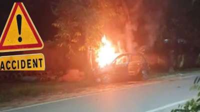 सड़क हादसे बाद कार में लगी भीषण आग, मचा हड़कप