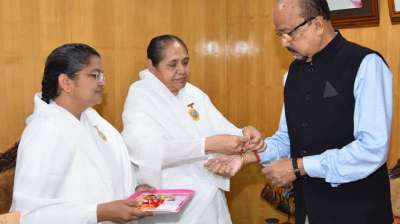 रायपुर : राज्यपाल रमेन डेका से आज यहां राजभवन मे प्रजापति ब्रम्हकुमारी ईश्वरीय विश्वविद्यालय रायपुर की बहनों ने सौजन्य मुलाकात की और राज्यपाल डेका को राखी बांधी।